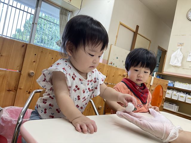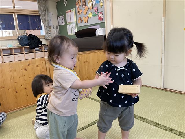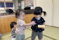 少しずつお友だちに興味が出てきたひよこ組の子ども達。遊びの中で楽しい、嬉しい気持ちになるとお友だちと気持ちを共有するようにタッチすることが増えてきました。これからもたくさん楽しい事や嬉しい事を増やしていっぱいタッチしようね。
