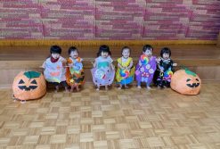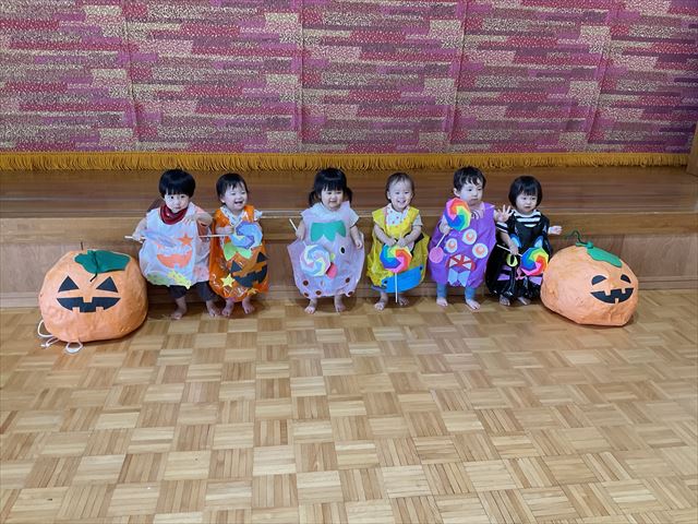 運動会の衣装を身に付けて少し早いハロウィンごっこ。お顔程あるキャンディを手に「いたずらしちゃうぞ!」といろんなオバケになりきりました。