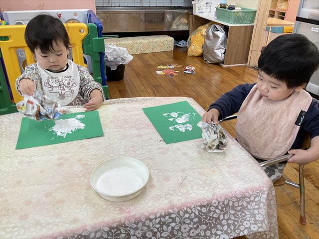 制作でスタンプ遊びをしました。最初に保育士がお手本を見せると、目を開いて興味津々な子どもだちでした。上手に真似をしてポンポンポンと何回も繰り返しながら楽しんで参加してくれました。可愛い作品のできあがり~☆