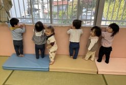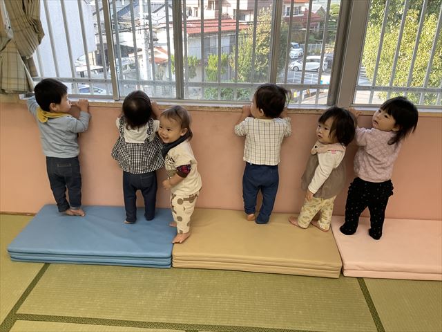 お部屋の中にマットを出しました。マットに登るといつもよりも少しだけ身長が高くなって、嬉しそうな表情をしていました♡その後は、お友だちと一緒に窓からの景色を堪能して、何かを見つけると「あっ」と指差ししながら教えてくれました。