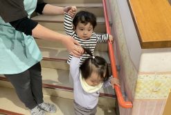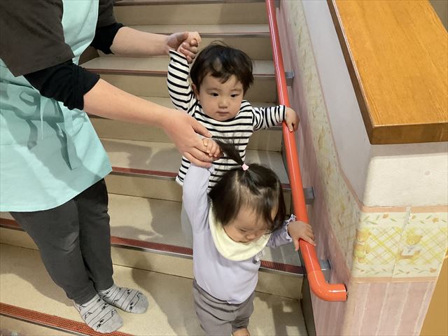 お部屋が2階になってから、階段の登り降りをする機会が増えたひよこ組さんたち。保育士と手をしっかりと繋いで、「よいしょ、よいしょ」と言いながら、自分の足でしっかりと歩くことができるようになってきましたよ。
