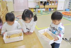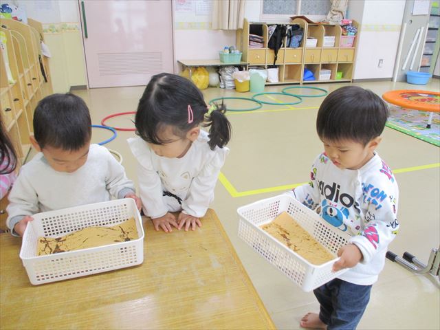 秋の自然物を使って遊びました。どんぐりをカップにたくさん集めたり、トングやスプーンですくってみたり、ぽっとん落としをしてみたり、思い思いに楽しそうに遊ぶことが出来ました。