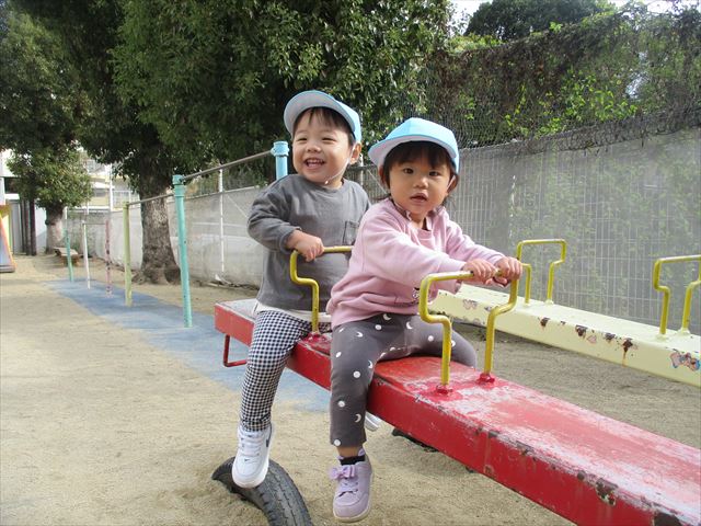 天気のいい日に戸外に出て遊びました。園庭散策をしながらジャングルジムを登ったりすべり台を滑ったり元気いっぱい遊び、中でもシーソーが人気で「もう一回!」と何度もシーソーを楽しんでいました♪