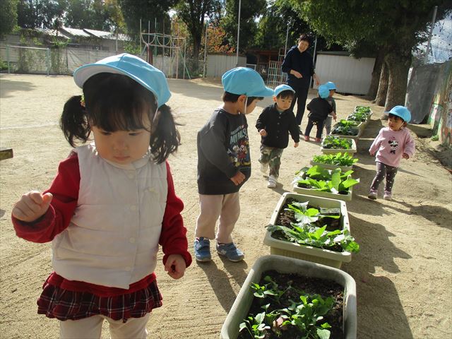 園庭散策をしていると、冬野菜が大きく育っているのを発見!子ども達も知っている野菜がたくさんで「♪だいこんはこんこんこんだね~」と、歌を口ずさみながら冬野菜の観察をしていました。