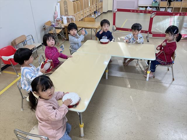 クリスマスソングに合わせて楽器遊びをしました。それぞれの楽器の名前や音の鳴らし方を聞いてから好きな楽器を選びました。鳴らしてみると、とても嬉しそうに体を揺らして楽しい楽器遊びになりました♪