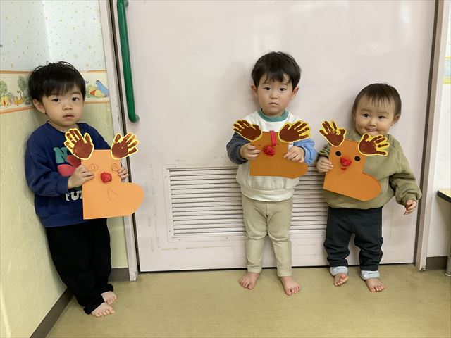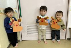 トナカイのクリスマスブーツを作りました。角は手形で表現して目と口はクレヨンで描いたりシールを貼ったり年齢に合わせて楽しく制作を行うことが出来ました♪中に好きなものを入れられるようになっているので、何を入れるのか楽しみだね♪
