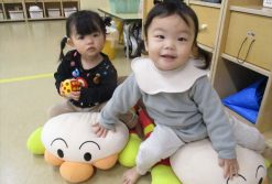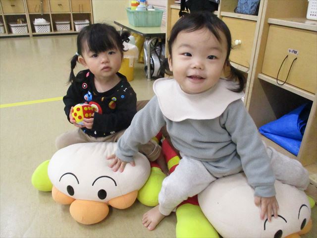 初めて一時保育を利用したお友だちと少し慣れてきたお友だち。日によって利用するメンバーが違いますが、みんなすぐに仲良くなって遊び始めます。泣いていても慣れる日が来るので大丈夫です♪人気のアンパンマンに乗って楽しく遊びました。来年もみんなが来てくれるのを楽しみに待っています♪