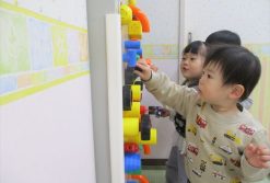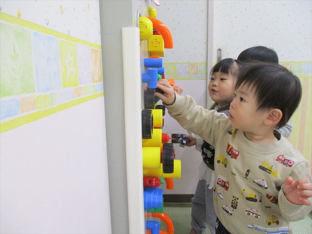 磁石遊びをしました。磁石がくっつくところを見つけると「あ!くっついた!」と、たくさんくっつけて遊んでいました。楽しそうに遊んでいると友だちも次々と集まって、順番にくっつけて交代しながら遊ぶことが出来ました。