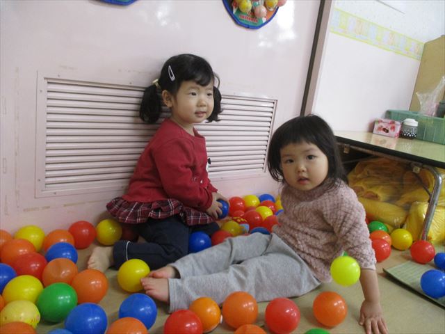 カラーボールを使って遊びました。雪に見立てて雪合戦をしたり、ボールを集めてボールプールのようにしたり、ボールの中を泳いでみたりして楽しく遊びました♪