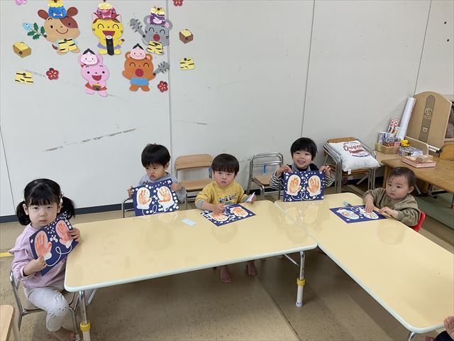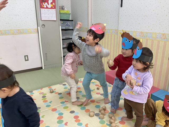 節分の日に、自分で作った表情豊かな鬼のお面をかぶって、鬼退治をしました。お面をつけた保育士に豆を投げ、果敢に向かって心の中の鬼をやっつけることが出来ました。本物の鬼食いもあり、意味を知ったり、においを嗅いだりして五感で節分行事を楽しむことが出来ました。