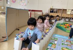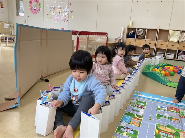 蛇腹の牛乳パックを電車に見立てて遊びました。「ガタンゴトン電車が出発しまーす」「いってきまーす」など、やり取りを楽しみながら、長い電車に乗って楽しい旅になりました♪