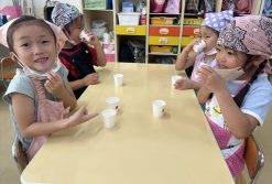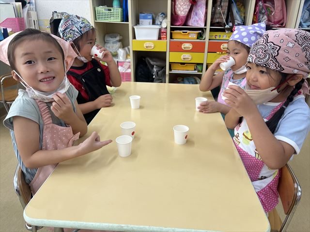 今日はクッキング活動で出汁について教えてもらいました。出汁は何から出来ているのかを教えてもらった後は、実際に飲み比べをしました。「出汁が入っている方が美味しい」と出汁の大切さを感じていましたよ♪