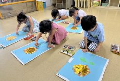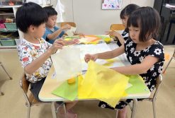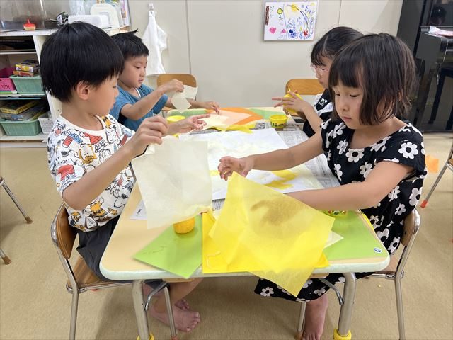 今日は、チームで制作をしました。画用紙に花紙をちぎって貼っていくと、端から貼るチーム・色ごとに貼るチームなどとチームごとで貼り方が違いそれぞれ個性が出ていました。みんなで貼った物を紅葉やイチョウの形に切り、秋の制作にする予定です♪