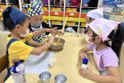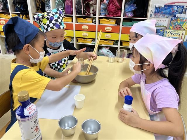 出汁を使って茶碗蒸しを作りました。卵を割る・調味料を入れる・混ぜる等の工程をチームごとで役割分担をしました。じゃんけんや話し合いで役割分担を決め、みんなで協力をしながら作ることが出来ました!