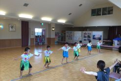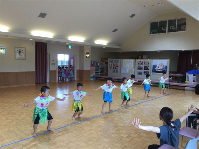 CS交流でおじいちゃん、おばあちゃんにフラダンスを見て貰いました。沢山練習をして披露すると「上手」「可愛い」などと沢山褒めてもらい、とっても嬉しそうな子どもたち。その後は、お礼に駒回しを見せてもらい、お部屋で駒回しをして楽しみました♪