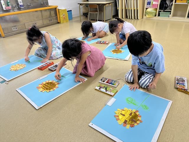 8月にお部屋に飾っていた“ひまわり”を画用紙に貼り、「セミが鳴いていたよね」「カブトムシもいるよね」と夏に見た物を思い出しながら葉っぱや太陽など好きな絵を描きました。夏の思い出の完成です。