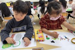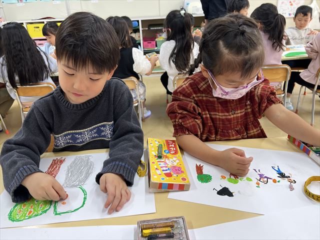 みかん電車に応募する絵を描きました。園外保育で見たみかんの木を思い出したり、給食で食べたみかんを描いたりしました。それぞれが思い思いに描き、とっても美味しそうなみかんの絵が出来ました!