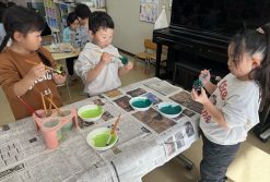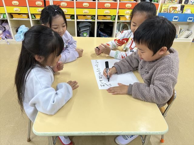 言葉集めゲームをしました。お題の文字が付く言葉をチームでこっそりと話し合って言葉を集めていく子どもたち。ひらがなもとっても上手に書けるようになりました。面白い言葉も沢山出て大盛り上がりでしたよ!