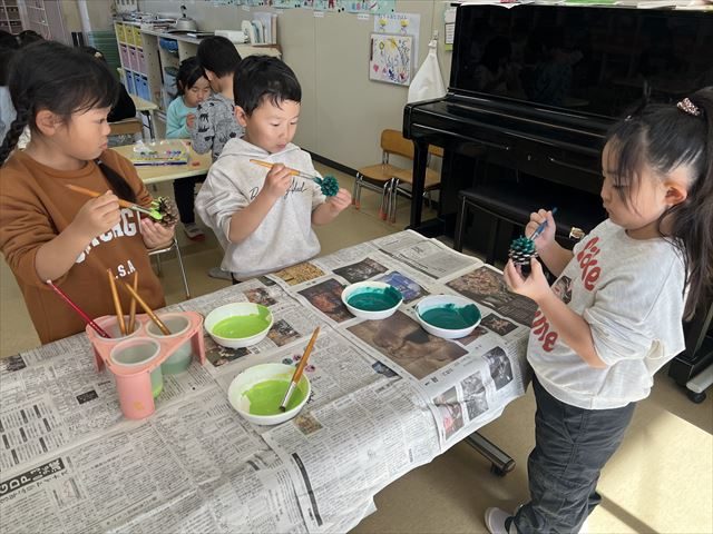 もうすぐクリスマス!松ぼっくりを使ってクリスマスツリーを作りました。カップに好きな絵を描いたり、松ぼっくりに絵の具を塗ったり…♪最後に飾りつけをして、完成★とっても可愛いツリーが出来ましたよ!
