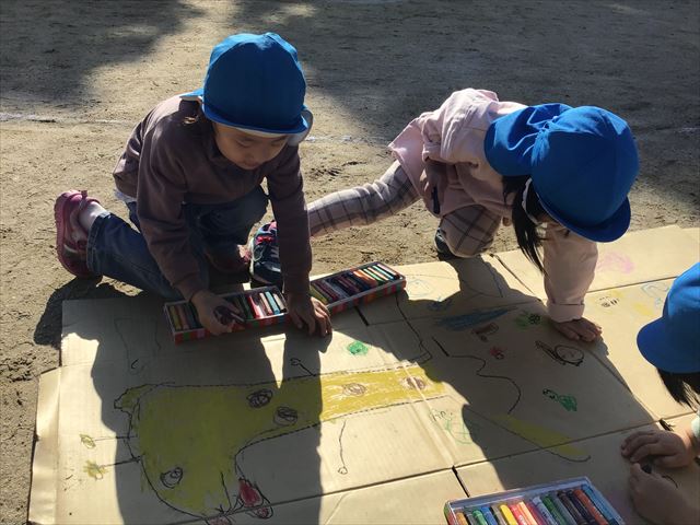 段ボールにお絵描きをしたよ。動物の絵や友だち、家族のことを絵に描いて見せてくれました。中には自分の名前など文字を書いて楽しんでいる子も!大きなキャンパスに描くのって楽しいね。