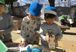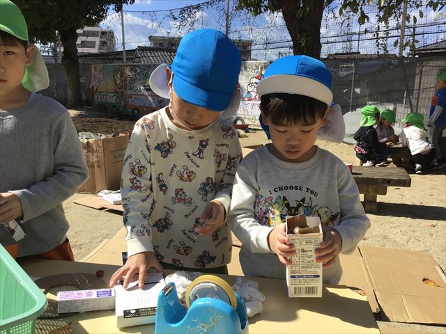 季節の物を使って、廃材遊びを楽しんでいます。松ぼっくりにどんぐりなど、中に入れて音の変化を楽しんだり、作品に引っ付けたりして可愛く製作していますよ。
