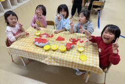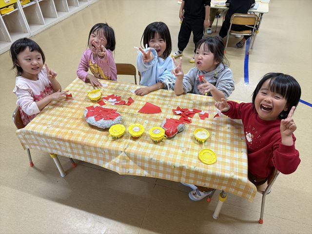 ぶどう、かき、さつまいも、きのこを作って、順番に採って楽しんだよ。うさぎ組さんを招待して、「とっていいよ」と優しく教えてあげていました!喜んでくれて良かったね。