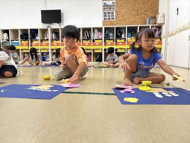 7月の制作のテーマは海のいきもの。『にじいろのさかな』の絵本を見て、絵本に出てきた〝にじいろさかな〟を作りました。キラキラの折り紙やすきな色の折り紙をハサミで切り、糊で貼ってうろこを作ると、自分だけのにじいろのさかなが完成。「光ってるね」と嬉しそうに見せ合っていました。