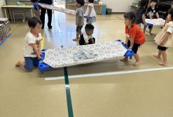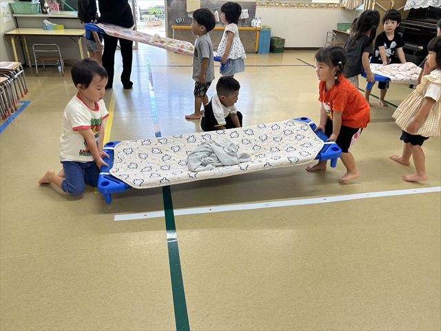 年少児クラスになって半年が経ち、自分たちでできることがどんどん増えてきました。最近では午睡に使用するコットを並べたり片付けたりもするようになりました。友だちと協力したり、手伝いができることがとても楽しい様子です。
