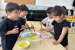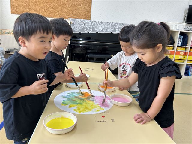 9月12日の宇宙の日にみんなで1つの制作をしました。ブラシを使ってスパッタリングをしたり、絵の具でにじみ絵をしたり、ロケットの形の廃材に色を付けたりと、自分で好きな技法を選んで作りました。友だちと「きれいだね」「こんな風になったよ」「もっとやろう」などと会話を楽しみながら1つの作品を作り上げることができました。