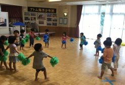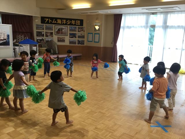 みんなが気に入った曲を使って表現遊びを楽しんでいます。ダンスに使うポンポンも保育者や友だちと一緒に作ったので、とても大切に使っています。今年は隊形移動にも挑戦!みんなで力を合わせて1つの隊形を作ることを楽しんでいます。「今日は踊らないの?」と子どもたちの方からリクエストがあるほど気に入っています。
