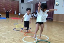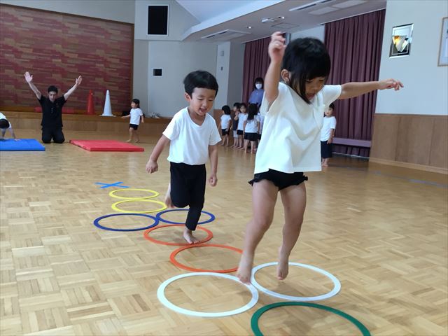 体操教室では跳び箱や前転などに挑戦しました。跳び箱では踏み切り板でジャンプして足を開脚することに少しずつ慣れてきて、跳び箱に跳び乗れるようになってきている姿も。輪っかの中をジャンプするのも、1つ1つ丁寧にグーパーと足を開いてジャンプしていました。