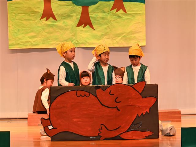 ホールで劇遊びを始めた時は、ちょっぴり恥ずかしそうにしていたとら組さんですが、だんだんとホールの雰囲気にも慣れ、楽しみながら歌や台詞を話し役になりきっていました。一人ひとりが自信を持ち、お友達と力を合わせて作り上げた赤ずきんの演技とても素敵でした☆