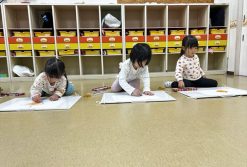 クレヨンを使ってみかんやみかん電車を描きました。子どもたちが想像しやすいように写真を見せると、みかんの丸い形を考えながら描いたり、慎重に色を塗っている姿がありました。自分が描いたものを保育者に伝える子もいて、自分が想像して描くことを楽しんでいましたよ!
