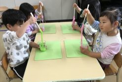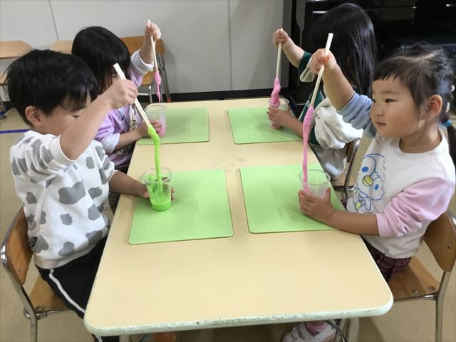 自分の好きな色の絵の具を選んでスライム作りを楽しみました。コップの中に魔法の水を入れてクルクルと混ぜるとだんだん固まっていくスライムに大興奮!!できたスライムを伸ばしたりちぎったりして感触遊びを楽しみました。