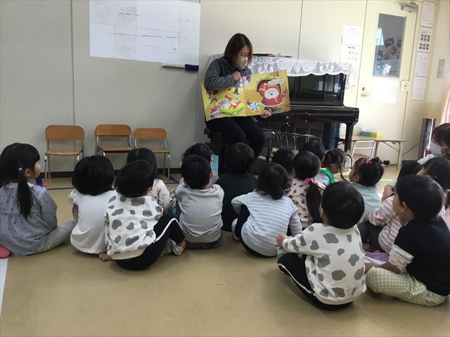 英語教室では、講師の先生の「12月は誰が来るかな?」との質問に元気な声で「サンタさん!!」と答えるとら組さん。クリスマスに関する絵本を見ながら、英語で数を数えました。講師の先生と一緒にツリーに飾るオーナメントを見て「○個あるよ!」とお話しながら絵本を楽しみました。