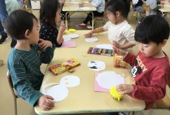 最近は園庭で廃材遊びを楽しんでいます。どんぐりや松ぼっくりなどの自然物や廃材を使って自分の好きな物を作っています。ガムテープなども苦戦しながら自分でちぎったり貼ったりに挑戦していますよ。またとら組は発表会に使う小道具も一緒に作ってみました。「〇〇に使うんよね」「これくらいでいいかな?」など、友だちとの会話も楽しんでいましたよ。