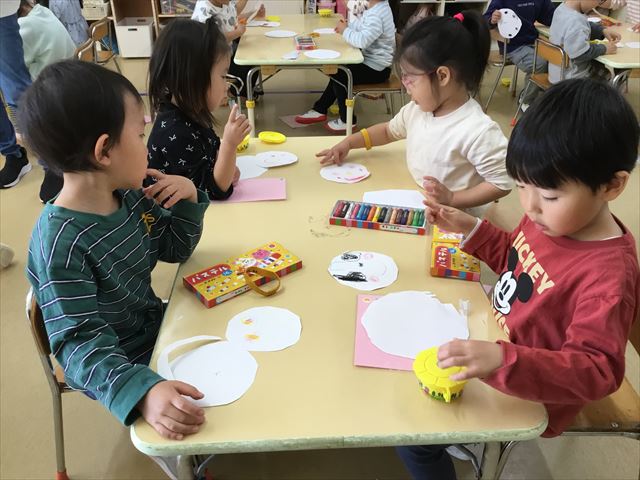 冬の制作では、絵の具やクレヨンを使って制作遊びを楽しみました。ハサミの使い方も少しずつ上手になり、最後まで頑張って円を切ることができました!そして、円の形に切った画用紙にそれぞれが思い描く可愛い雪だるまのお顔を描きました。