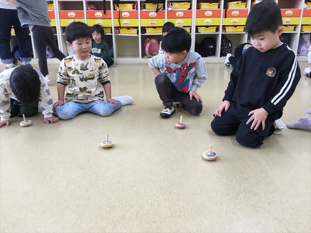 お正月遊び第一弾はコマ回し。まずはコマに自分で好きな模様を描きました。絵を描く時にも、好きな絵を描く子や回った時にきれいな模様になるようにと考えて描く子と様々。出来上がるとさっそく回していました。始めはうまく回せなかった子も、挑戦しているうちにコツを掴んで回せるようになり、コマ回し大会もして楽しみました。
