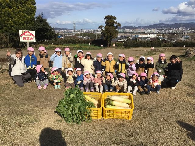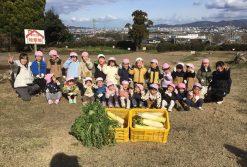 楽しみにしていた今年度最後の収穫体験、大根掘りに行ってきました。畑に着くとさっそく掘ろうとするほどのやる気満々の子どもたちでしたが、大根の掘り方をしっかり教わり、無事に収穫することができました。とても大きい大根ばかりで、「見てー!」「こんなに大きいのが採れた!」と大興奮でした。