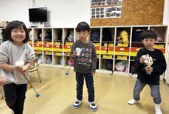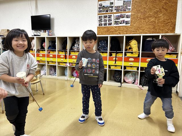 お正月遊び第二弾はけん玉。「けん玉って何?」の声もありましたが、手本を見せると興味津々。紙コップに絵を描き、玉もすべて自分で作って完成させました。けん玉に挑戦してみると、玉がうまくコップに入らず苦戦してましたが、何度も挑戦しているうちに「あっ!できた」「先生見て、できたよ」という声が聞こえるようになり、あっという間に上達していました。