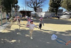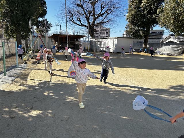 お正月遊び第三弾は凧あげ。袋にペンで絵を描いて、自分だけの凧を作りました。出来上がった凧を持って園庭に出てみると、丁度良い風が吹いていて、走るときれいに凧が揚がりました。うれしくてたくさん走って凧を揚げていましたよ。
