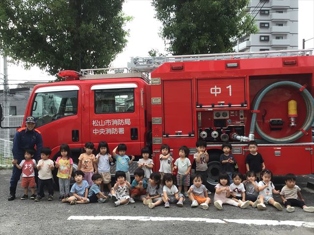今月は、消防士さんが立ち合って避難訓練を行いました。消防車が来てくれて、一緒に記念写真が撮れました!自動車が大好きりす組さん、「消防車だ!おおきいね」「赤いよ!」と大きさや色など今までとは違った場所に目を付けていました。次回消防車が来てくれるのが楽しみだね。