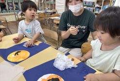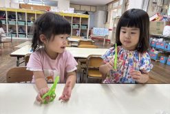 夏祭りに向けて風鈴の制作をしました。ガチャガチャのカプセルに両面テープを貼ったカラーセロハンを自分たちで貼りました。指先の力を使うことが上手になったりす組さん、すごく集中して製作できていました!