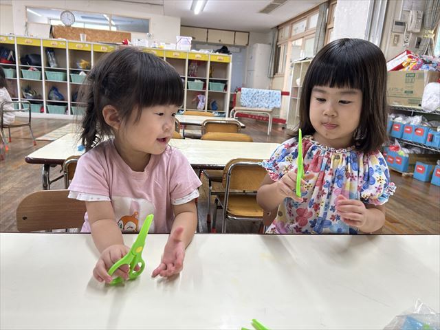はさみを使っての制作あそびに挑戦をしました。本物のはさみを使う前に練習用のはさみを持って、開いて閉じるの練習をしました。持ち方を難しそうにする子もいますが、開く・閉じるの動作はすご上手にできていましたよ♪