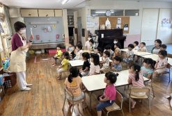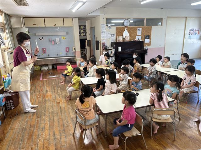 2回目の歯磨き指導がありました。ご飯を噛む歯の場所を模型の口で教えてもらい、興味深々に見ていました。お口体操やうがいの仕方など、お口をいっぱい動かしながら楽しく学びました。