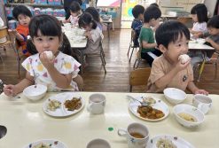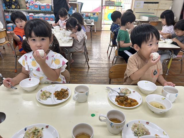9月の食育はお米についてのお話しでした。給食では、いつものお茶碗に一人一つおにぎりが!!子どもたち嬉しそうに手に持って食べていましたよ。大切に食べようとしていたので、子ども達なりに、お米の大切さを感じでくれたように思いました。