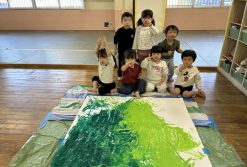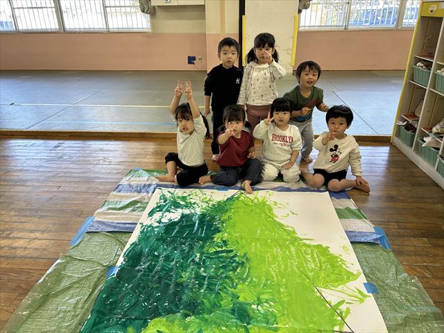 クリスマスツリーの制作をしました。初めてのみんなでのダイナミックな制作に挑戦し、大きな模造紙に手に絵具をつけてペタペタと色をつけていきました。子ども達とっても楽しそうで、グループごとで色の混ざり方の違うすてきなツリーが完成しました✨プレゼント届くかな、、?