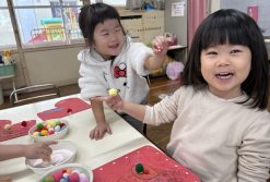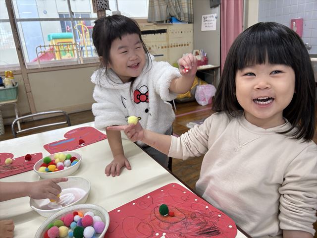 デコレーションボールを使っ靴下を制作しました。“ふわふわ、むぎゅむぎゅ”した不思議な感触のボールに興味津々で、丁寧に靴下の土台に貼り付けていた子ども達でした!カラフルで可愛い靴下が完成しましたよ。