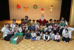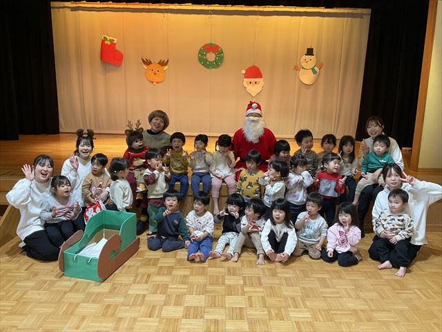 えっちゃんのお話を聞いたり、保育士による演奏を聞いたりして楽しみました。演奏では、「あわてんぼうのサンタクロース」を一緒に口ずさんでいました!また、サンタさんからクリスマスプレゼントを貰い、大喜びの子どもたちでした!!