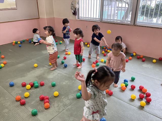 カラーボールで遊ぶのが大好きなうさぎ組さん。ボールを手に取り「あか~!あお~!」と色を教えてくれて、『どんな色が好き』の歌を歌って楽しんでいましたよ。段ボールで囲いを作りボールプールをすると、楽しくて大人気の遊びになりました。